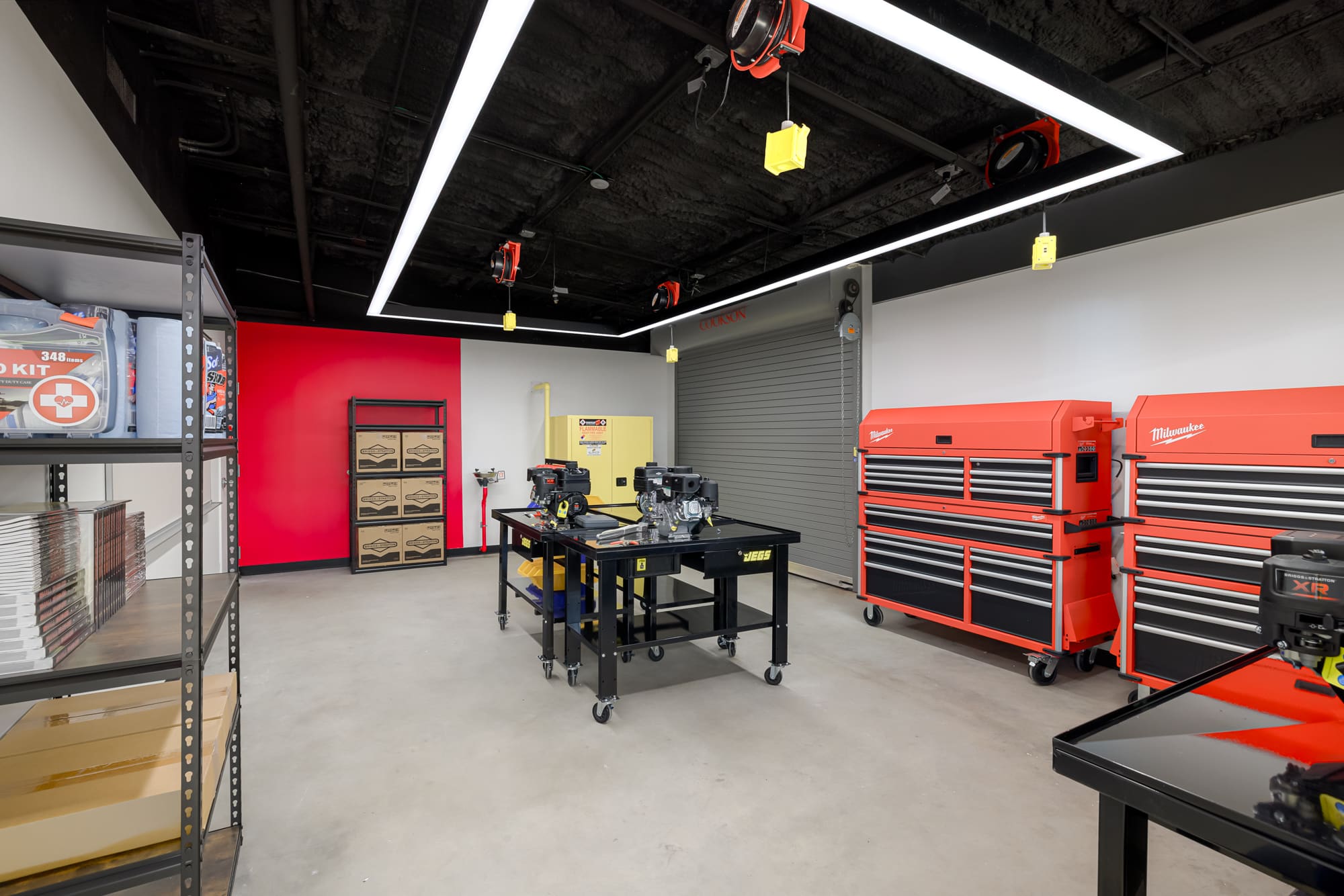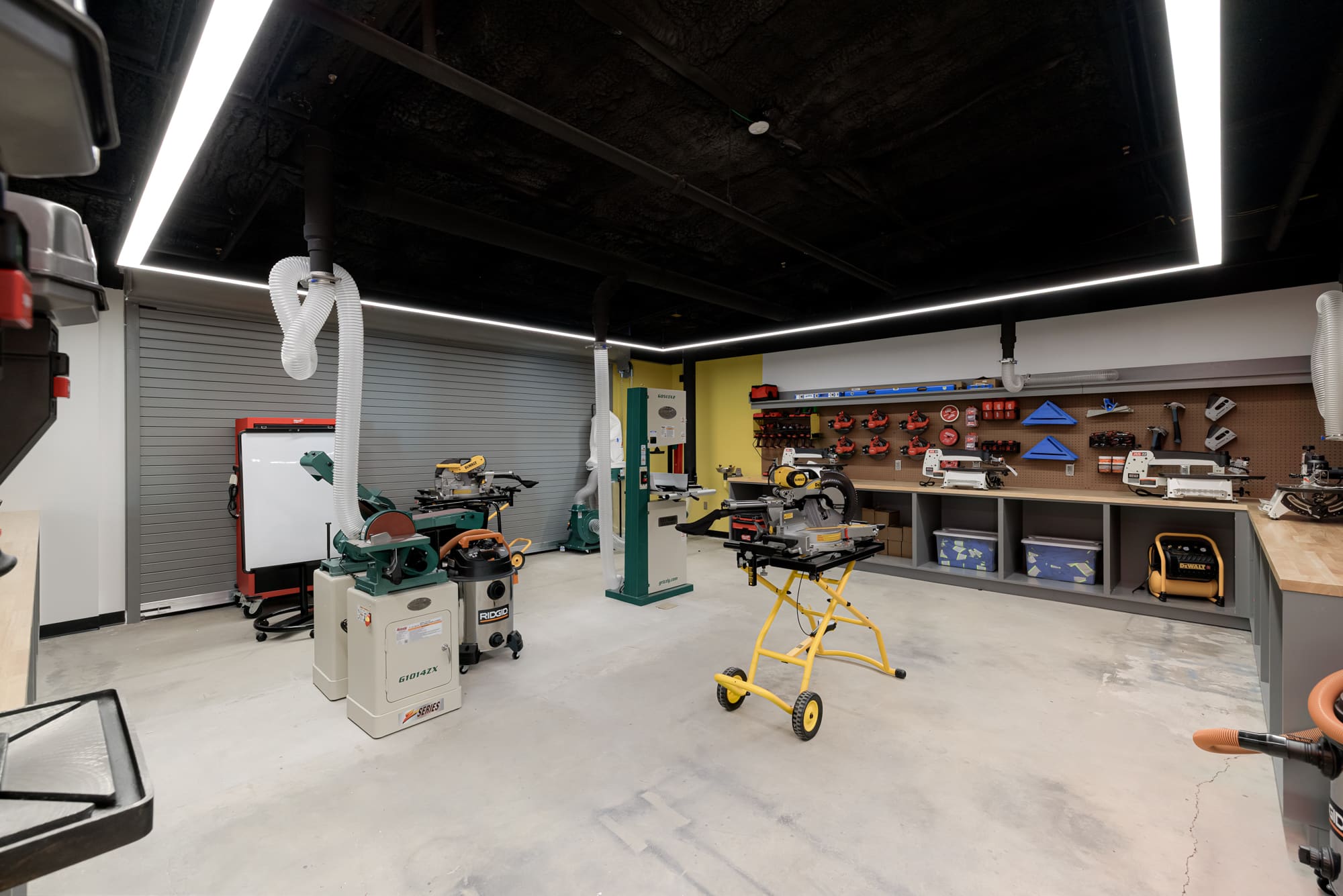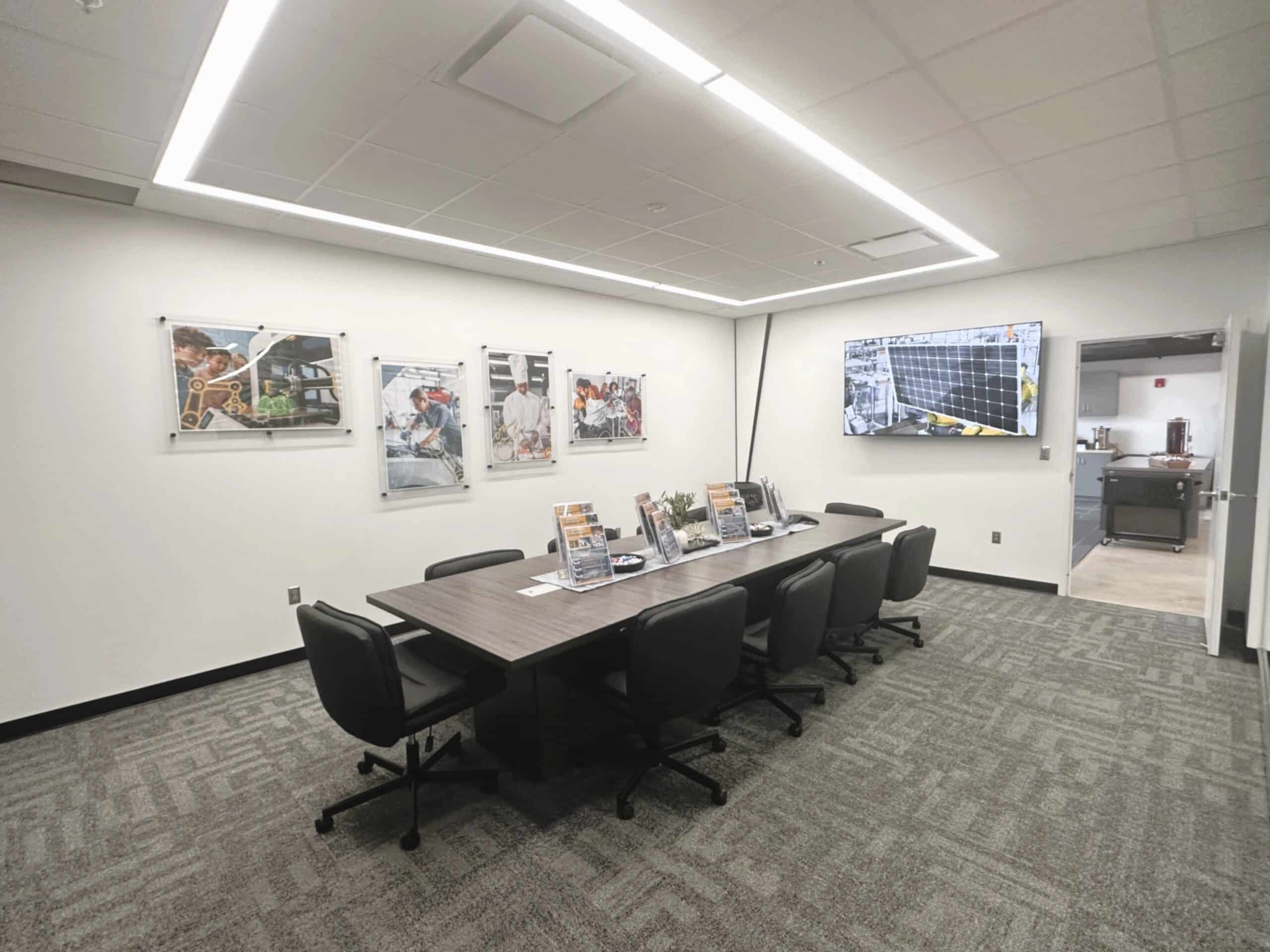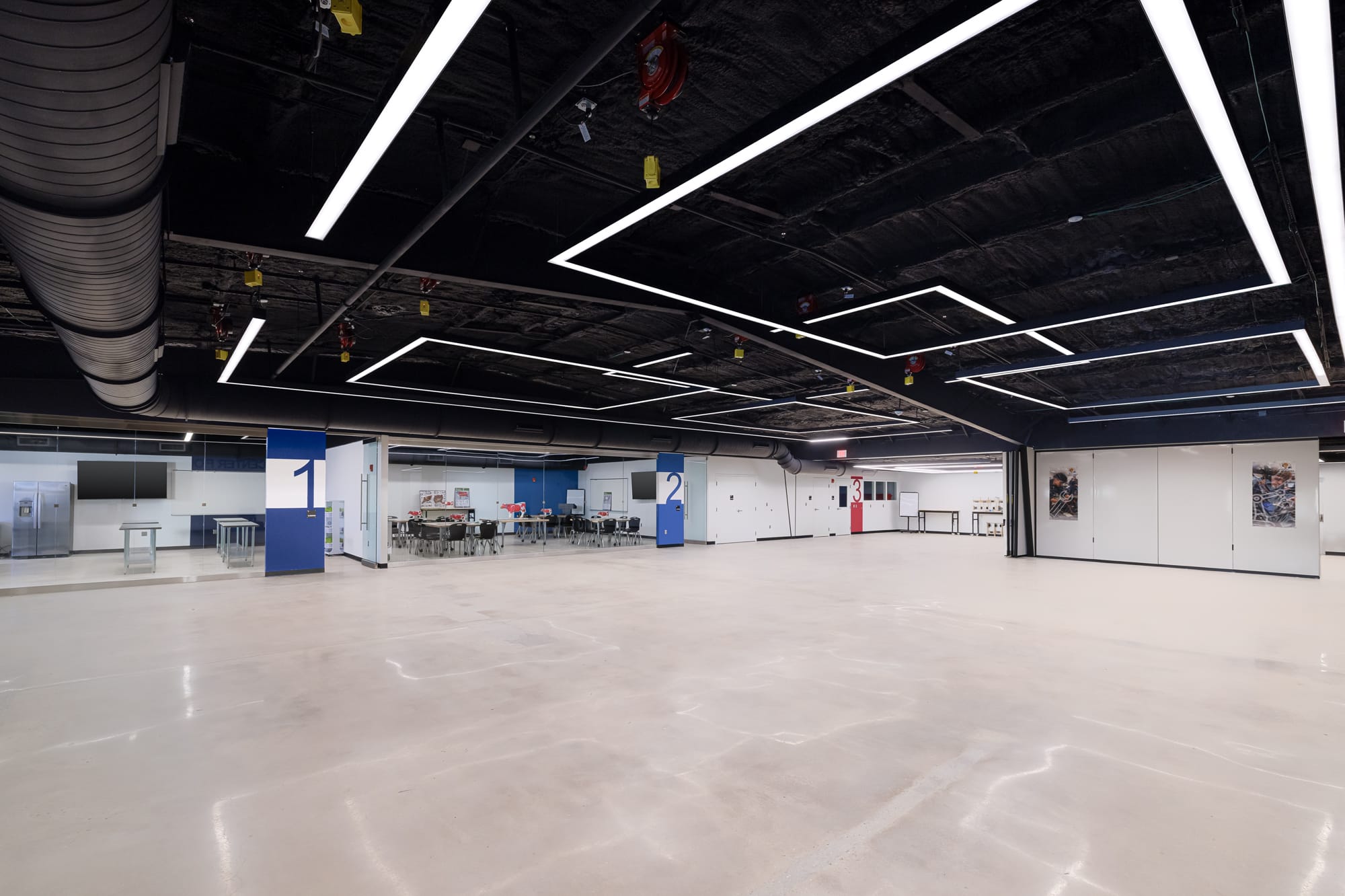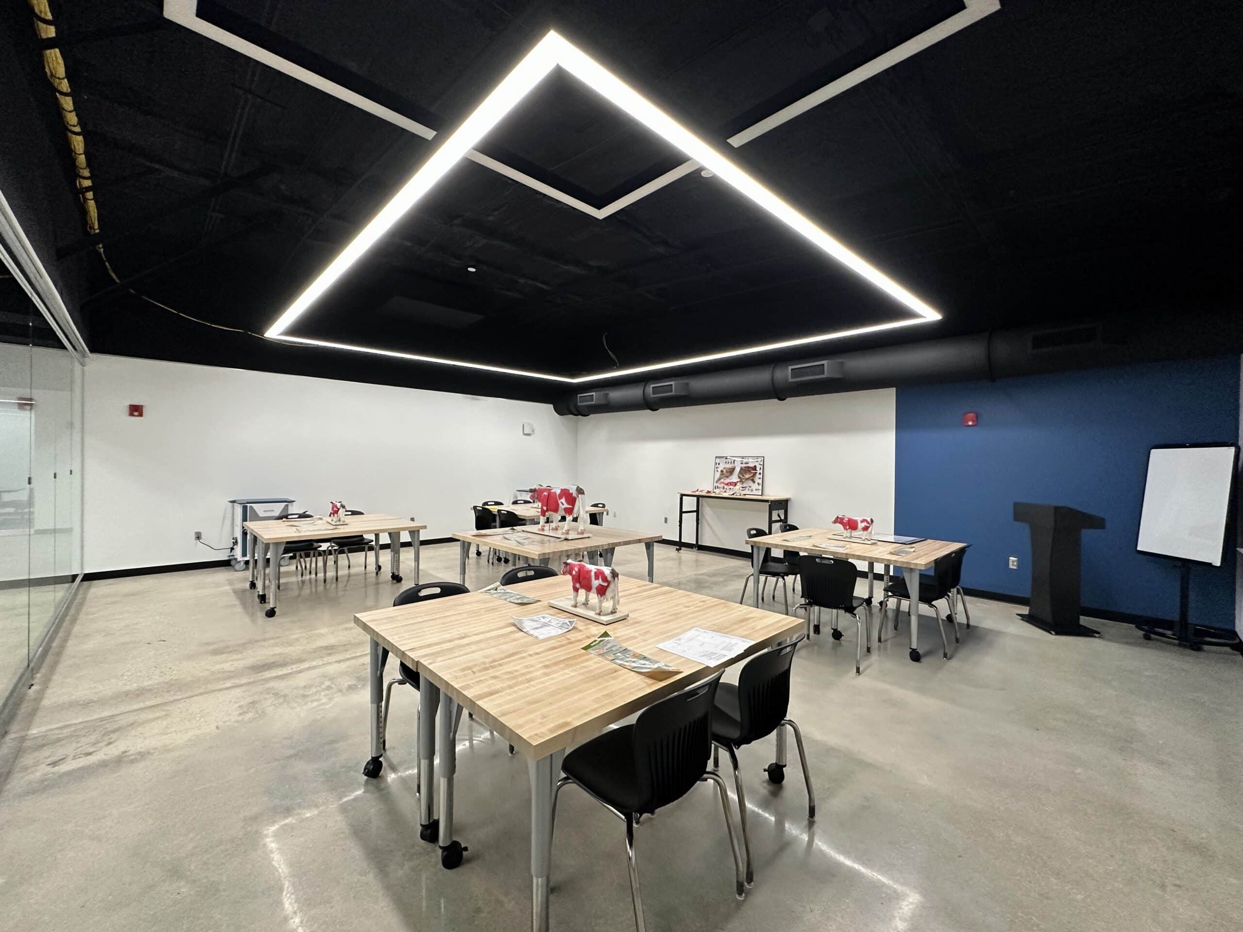 The completed Center features a large makerspace equipped with 3D printers, drones, and robotics, along with specialized labs for culinary arts, automotive technology, and construction trades. Flexible classrooms were incorporated to support dynamic and interactive instruction, and the open, glass-accented design allows innovation and student activity to be on full display throughout the space.