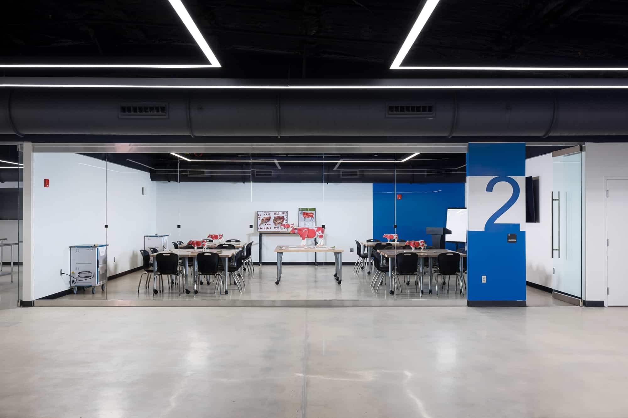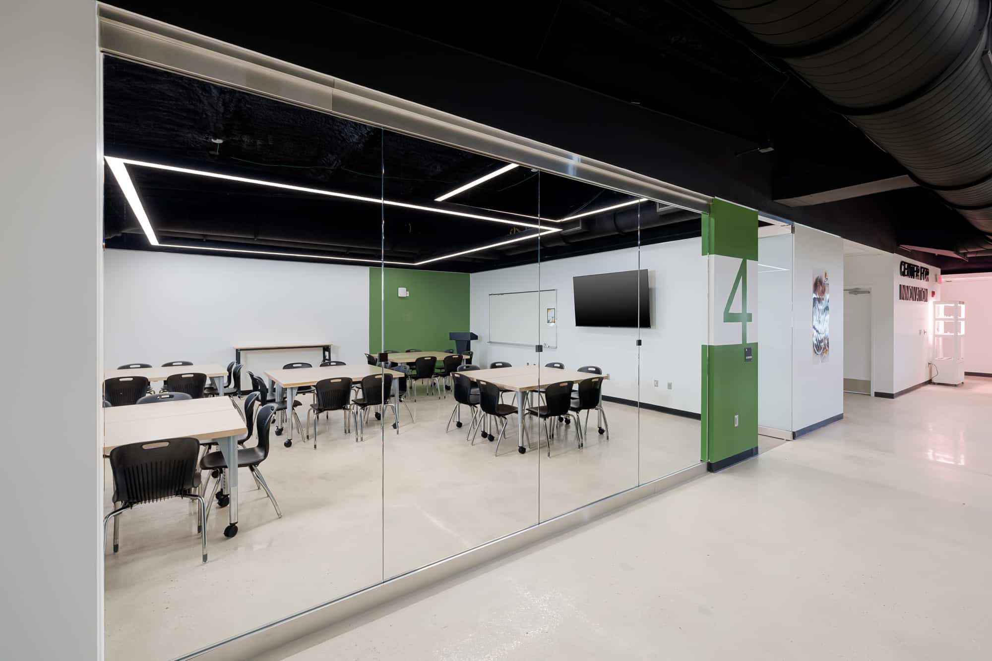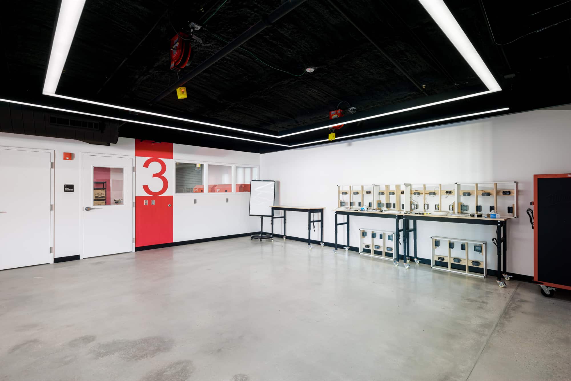 The scope of work included the construction of new interior partitions, including interior storefront wall systems with expansive glazing to promote visibility into classrooms and labs, creating an open and engaging environment that showcases student learning and collaboration. Additional work included replacement of existing interior finishes, installation of a new HVAC system, and replacement of existing lighting to improve efficiency and performance. A new fire sprinkler system was also installed throughout the facility to enhance life safety.